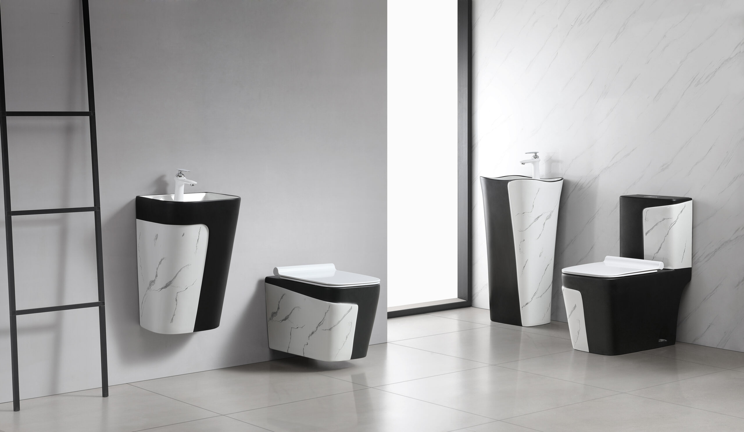 Black and White Marble Pattern Lavatory Furniture Set One Piece Standing Washbasin Household Hotel Bathroom Pedestral Basin Sinks