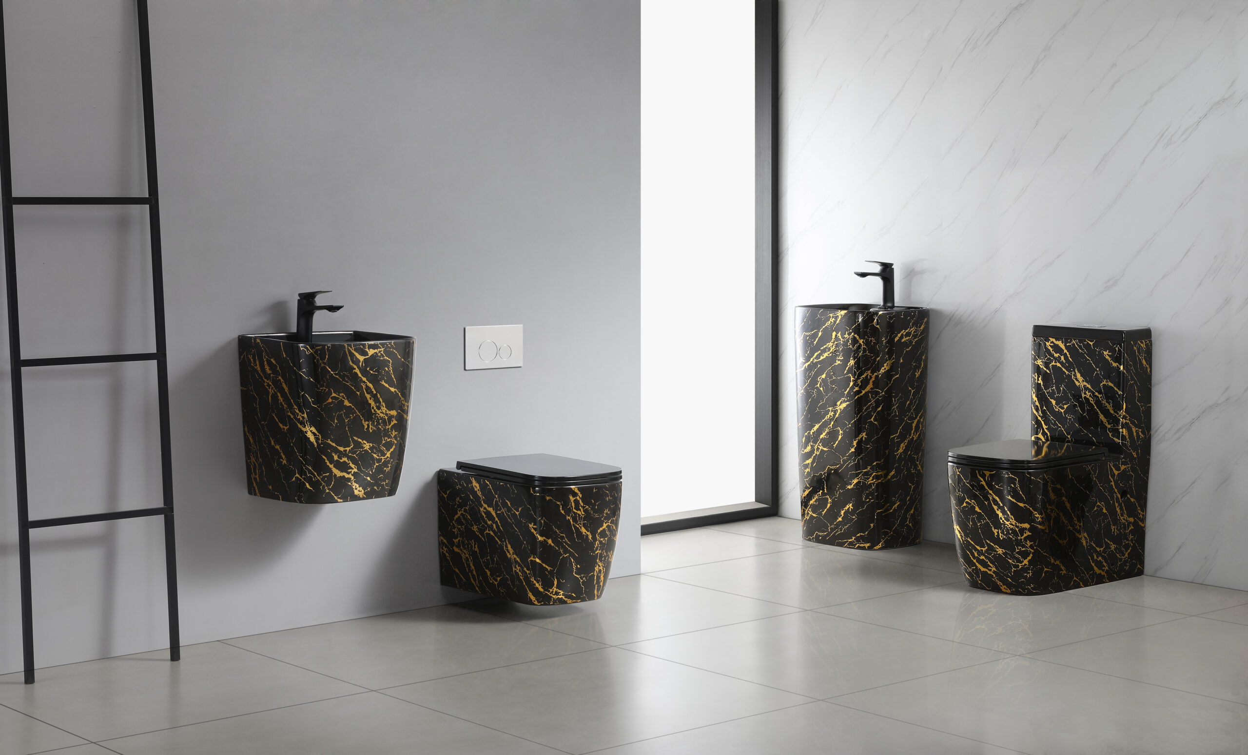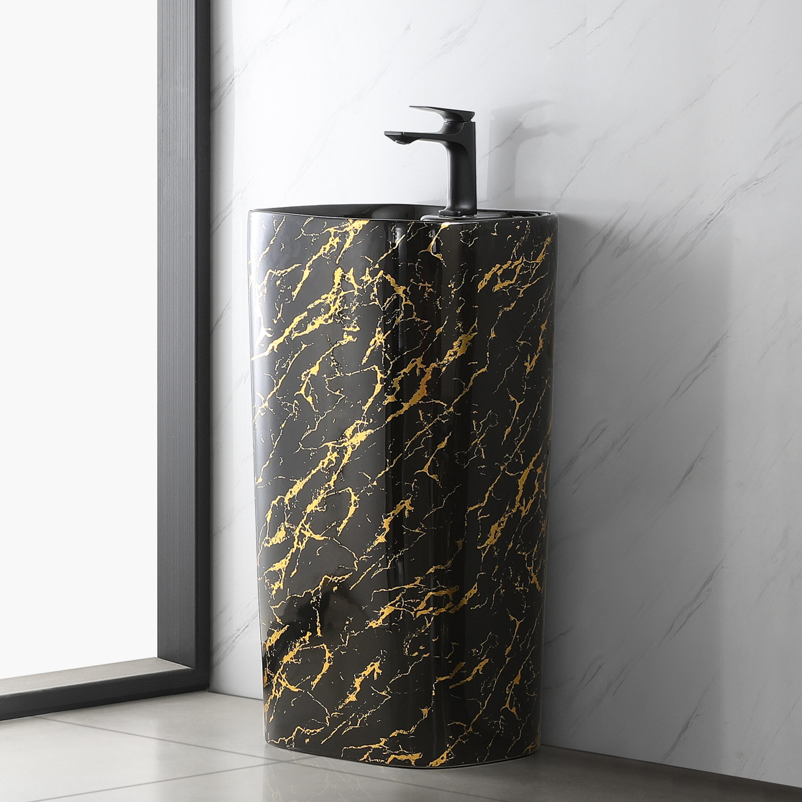 Black Glazed Ceramic with Gold Curve Sanitary Wares Combo Floor Mounted One Piece Basin Pedeatral Sinks Bathroom Washbasin
