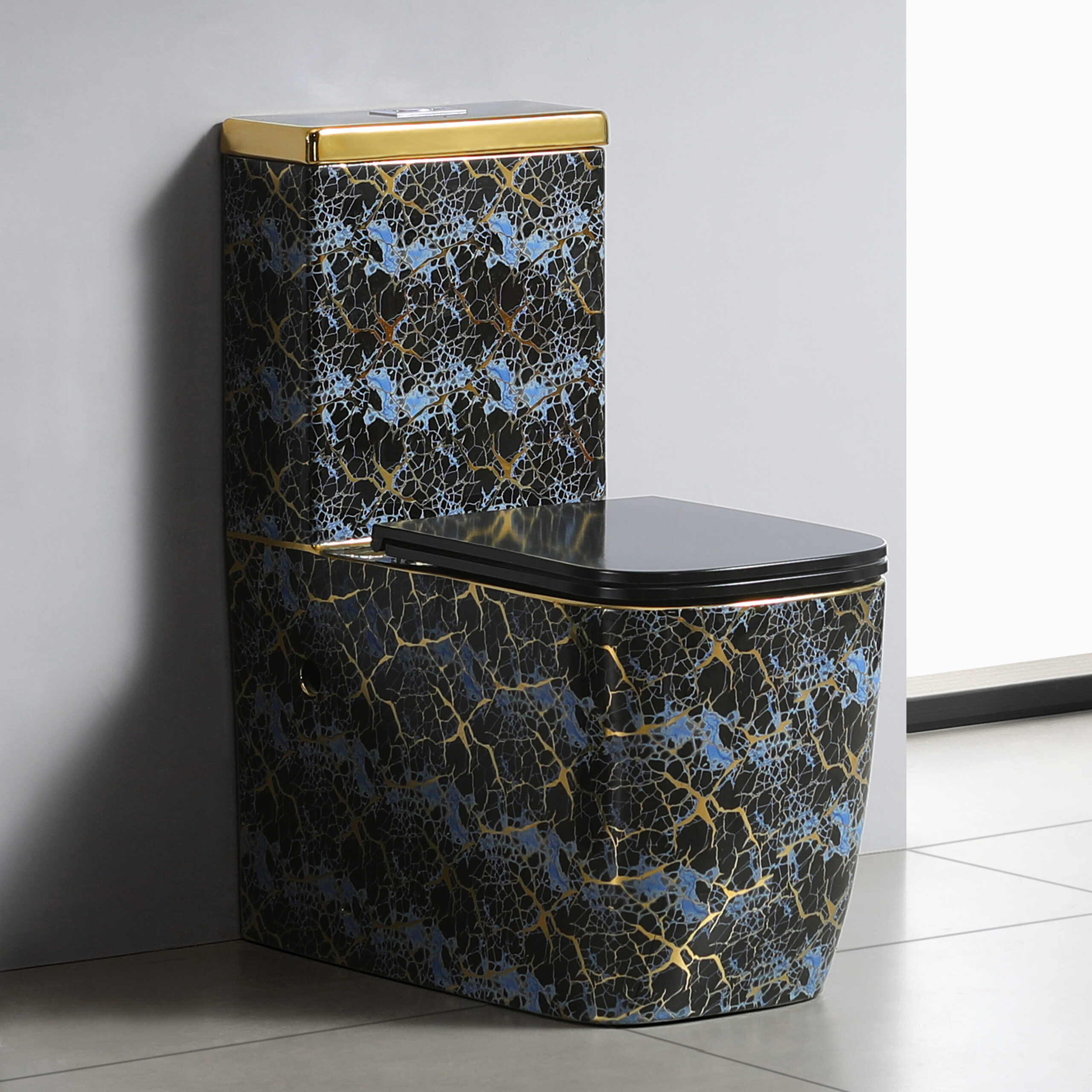 Blue Pattern with Golden Curve Black Glazed Ceramic Sanitary Wares Set Standing One Piece Toilet Commode Bathroom Toilets Bowl Wc