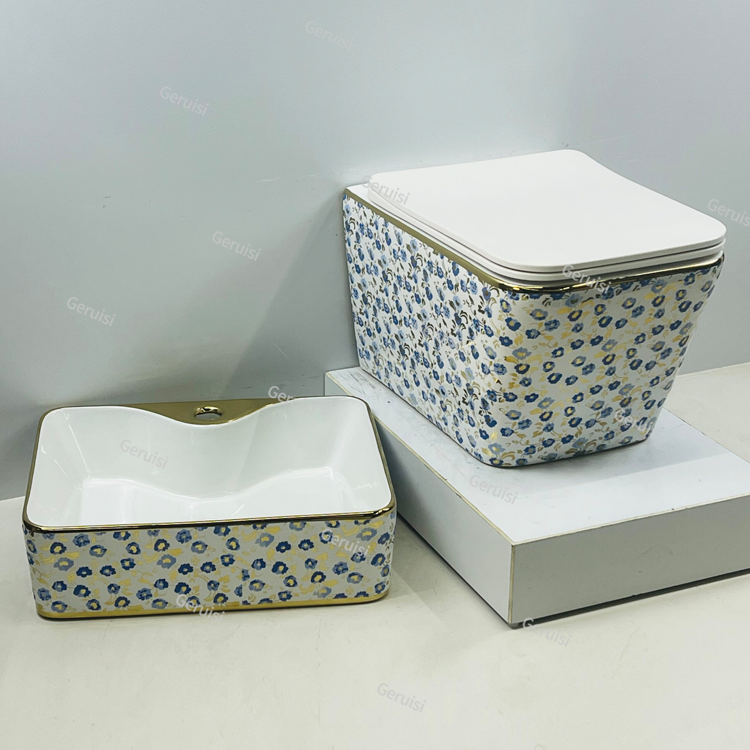 Colorful Spot Pattern WC Wall Mounted Water Closet Ceramic Table Top Square Shape Washbasin Bathroom Sanitary Ware Set