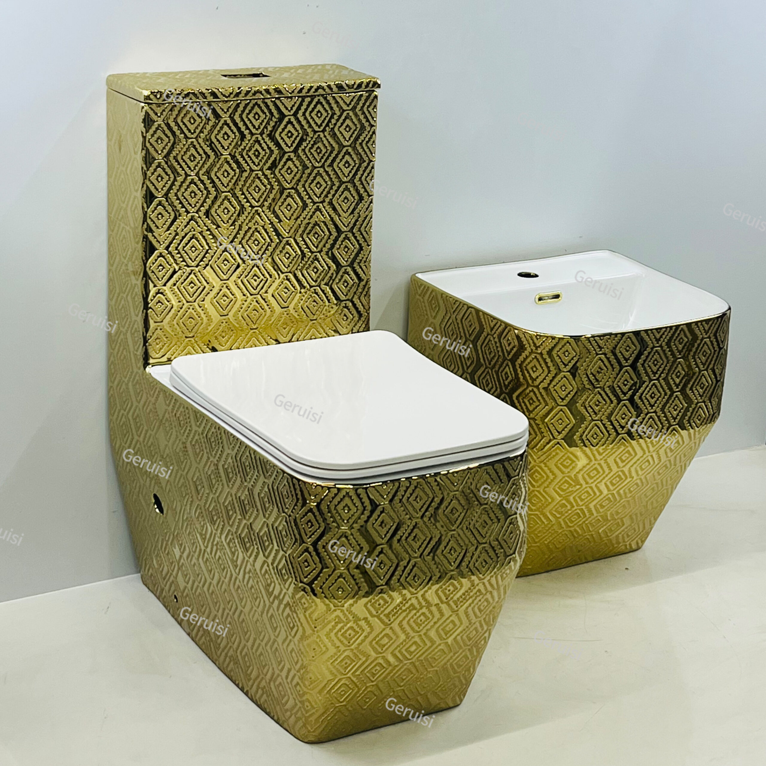 Contemporary Design Electroplated Golden Art Pattern Floor Standing Toilet Wall Hung Basin Luxury Bathroom Furniture Unit