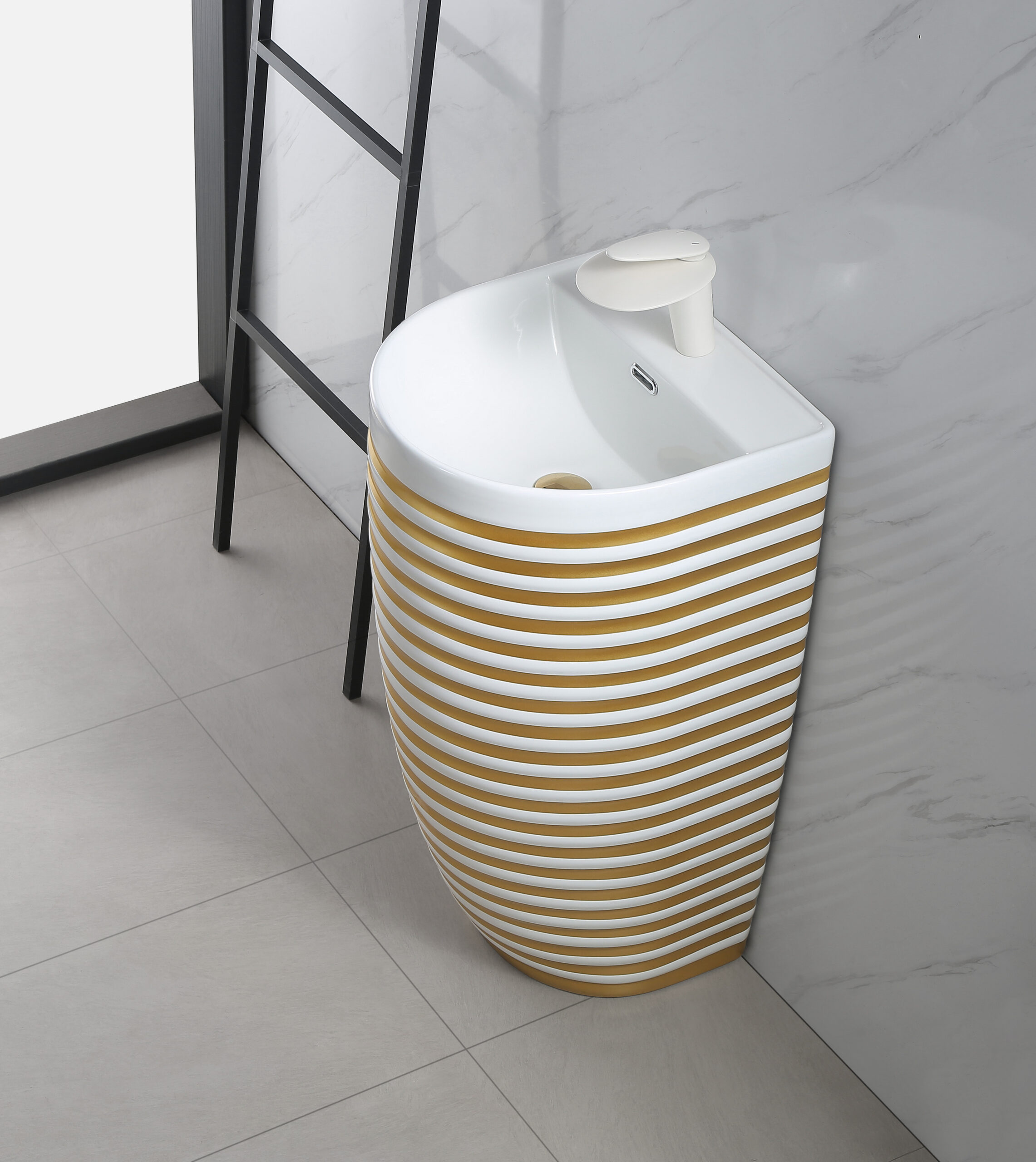 Contemporary Golden Stripe Standing Basin Lavabo Floor Mounted Bathroom Sink Gold Line Pattern Ceramic Hand Wash Basins