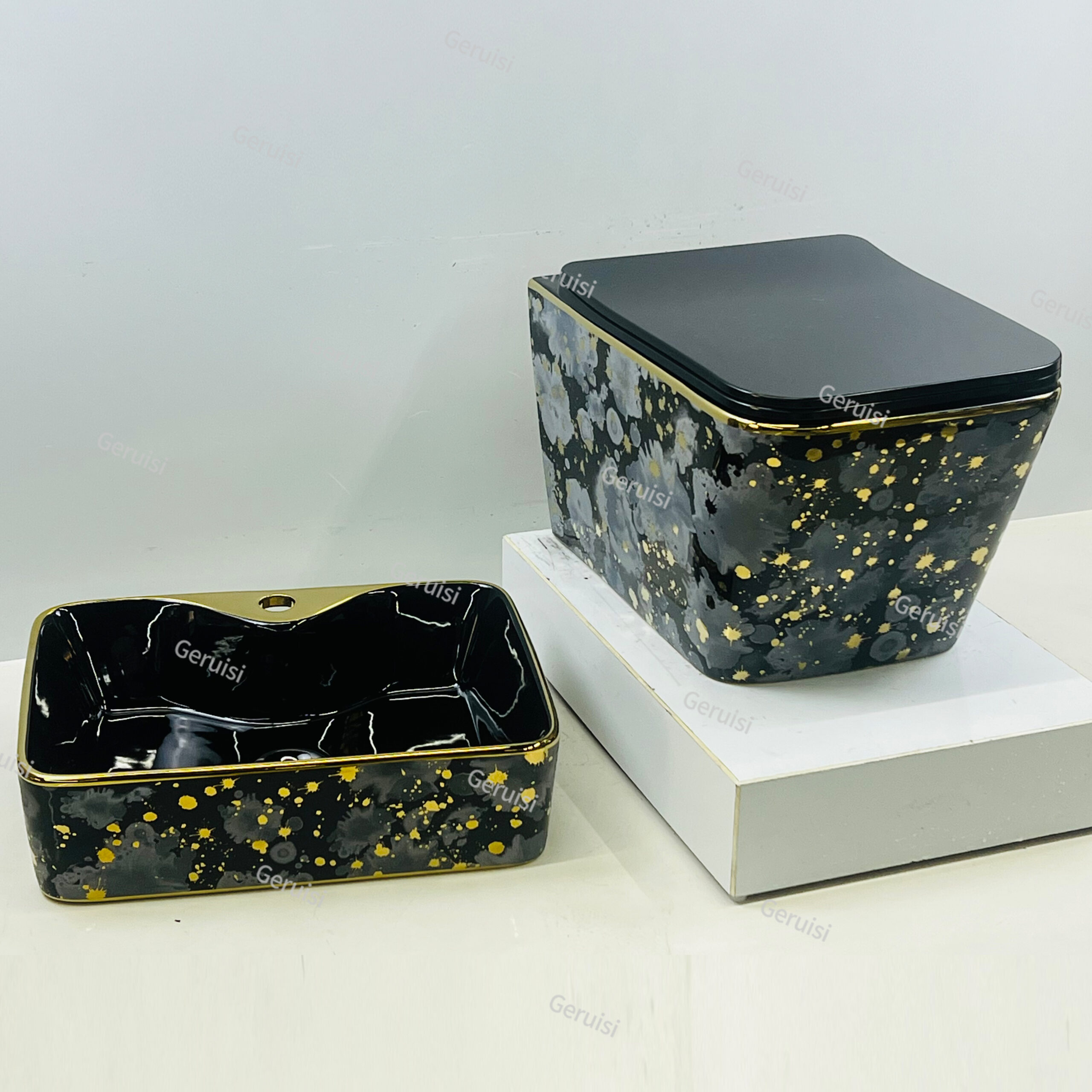 Creative Design Golden Spot Spray Pattern Black Square Toilet & Basin Artistical Bathroom Furnitures Combination