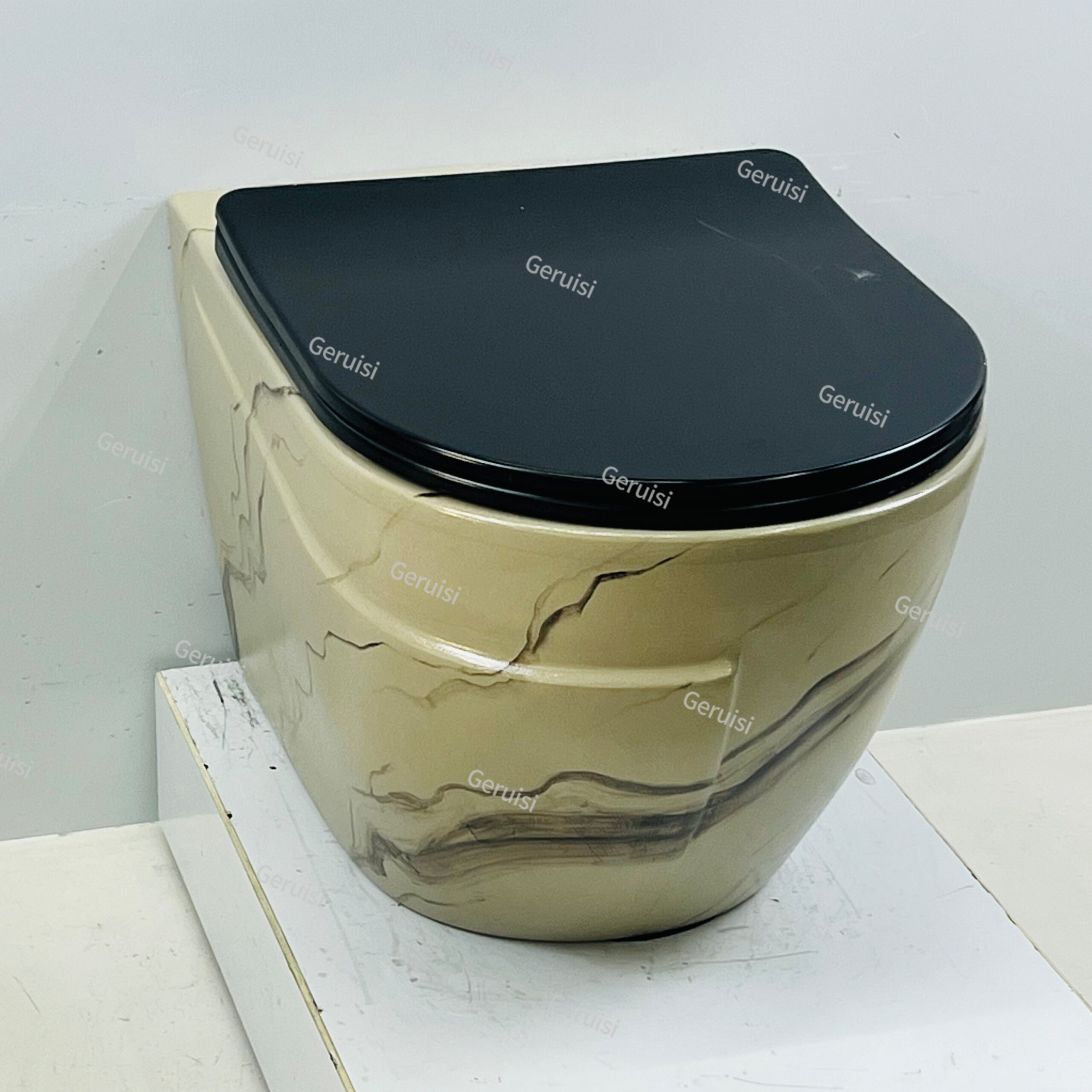 Euro Toilette Salle De Bain Dore Ceramic Sanitary Wares Wall Hung Curved Toilet Golden Marble Pattern Bathroom Toilet Bowl