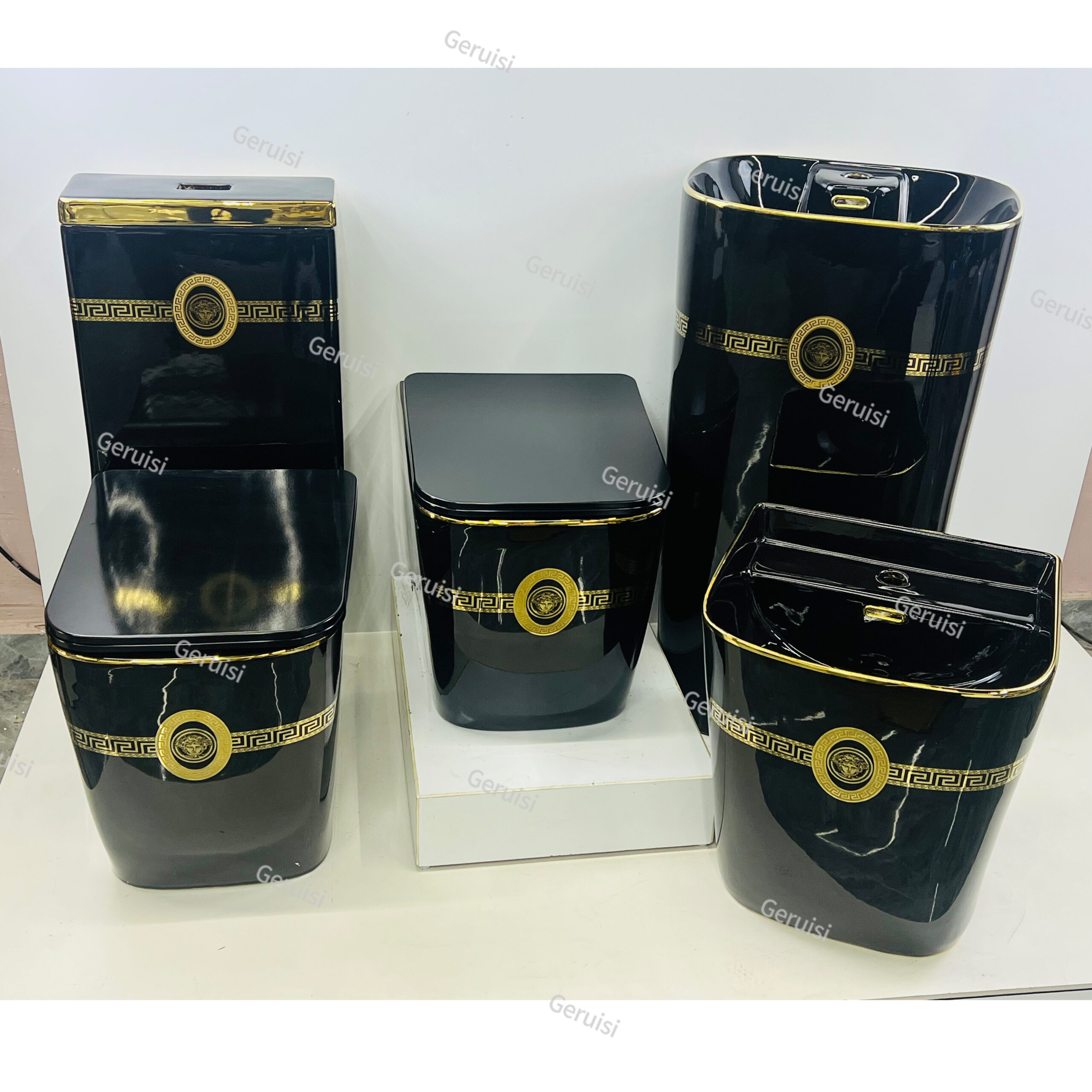 High End Royal Design Electroplated Black Golden Drawing Toilet & Basin Artistical Lavabo Interior Design Combination For Luxury Bath