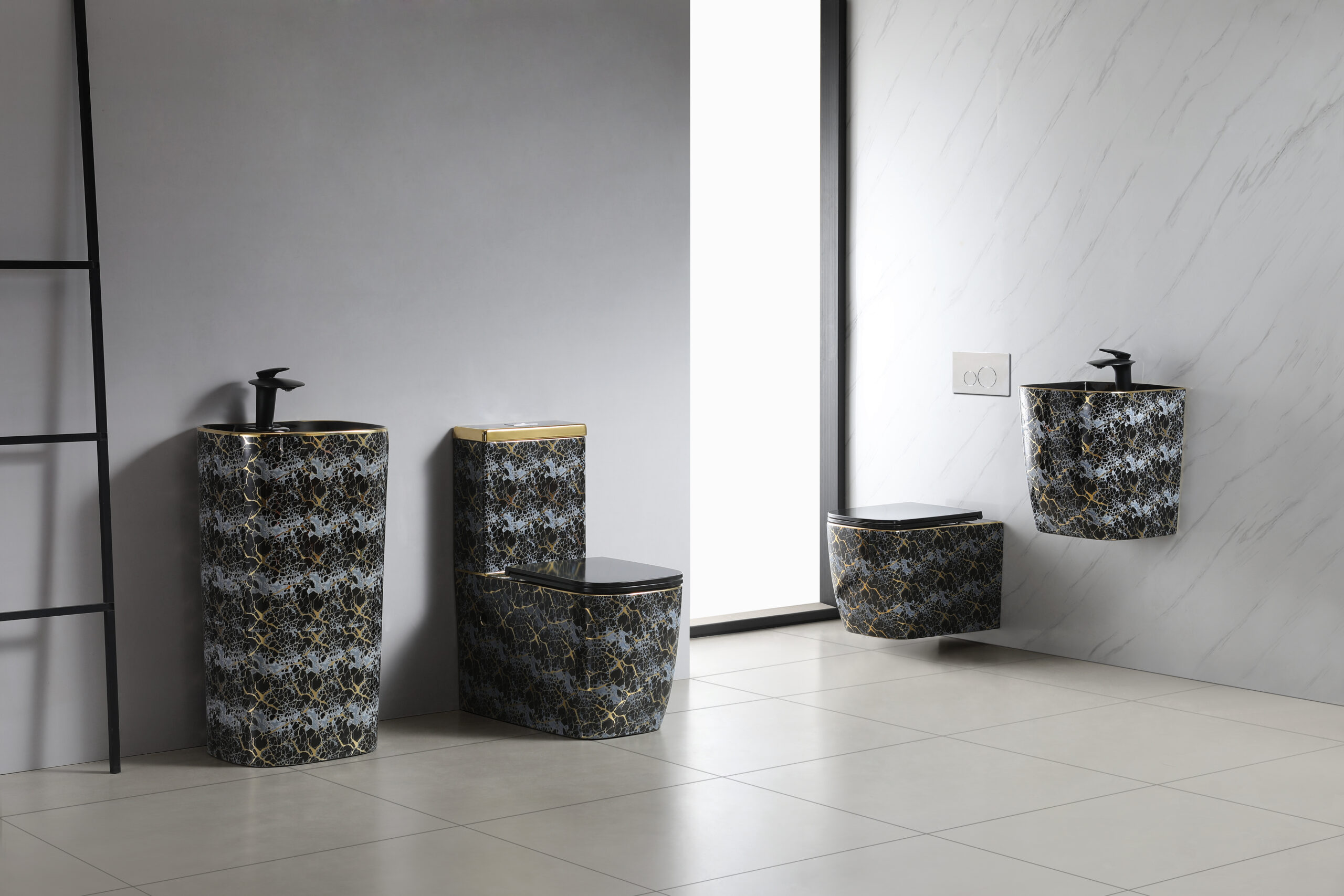 Luxury Ceramic Sanitary Wares Combo Floor Mounted One Piece Grey with Gold Pattern Basin Pedeatral Sinks Bathroom Washbasin