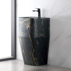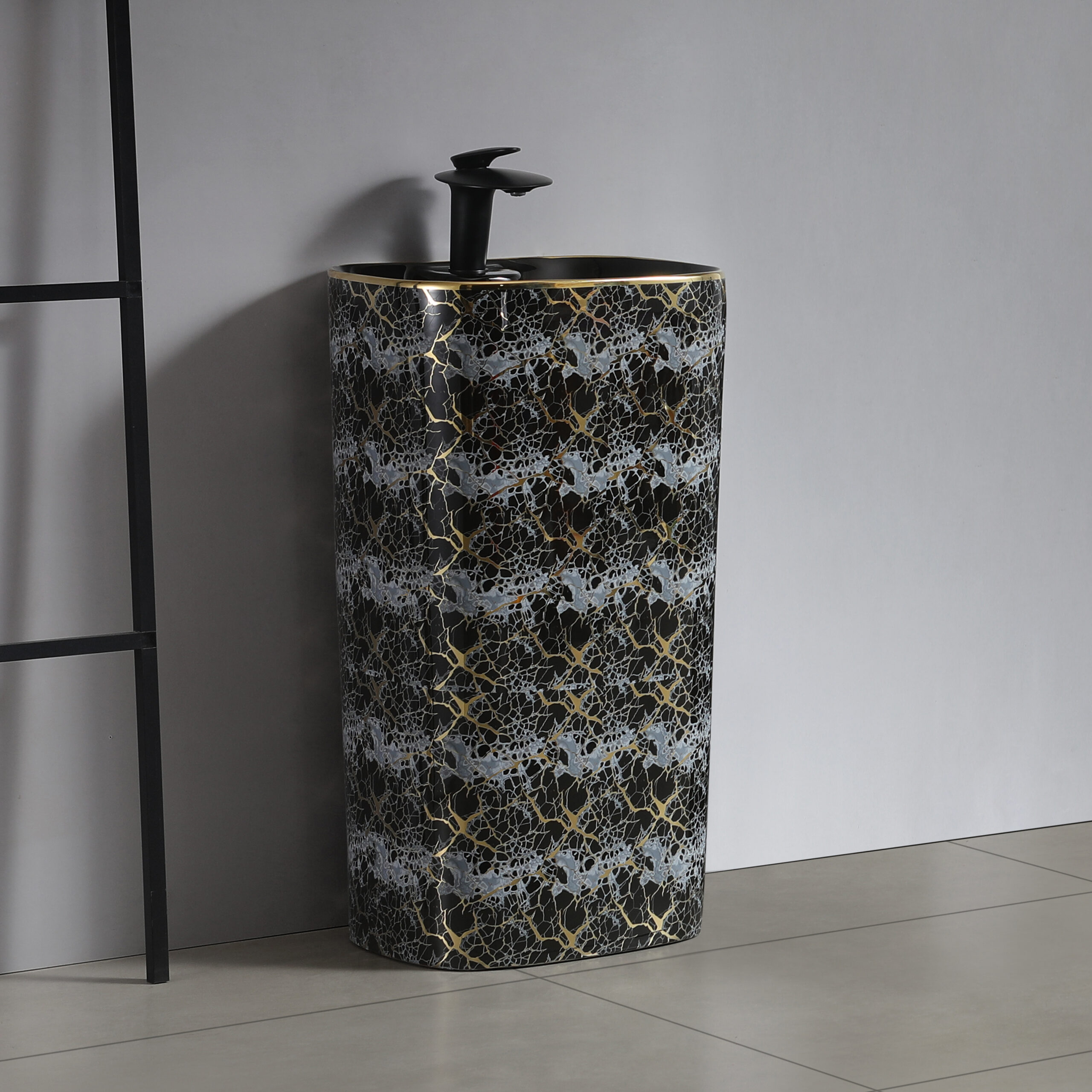 Artificial Stone Pattern Sanitary Wares Unit Black Gold with Marble Grain Integrated Floor Standing Basin for Bathroom Balcony