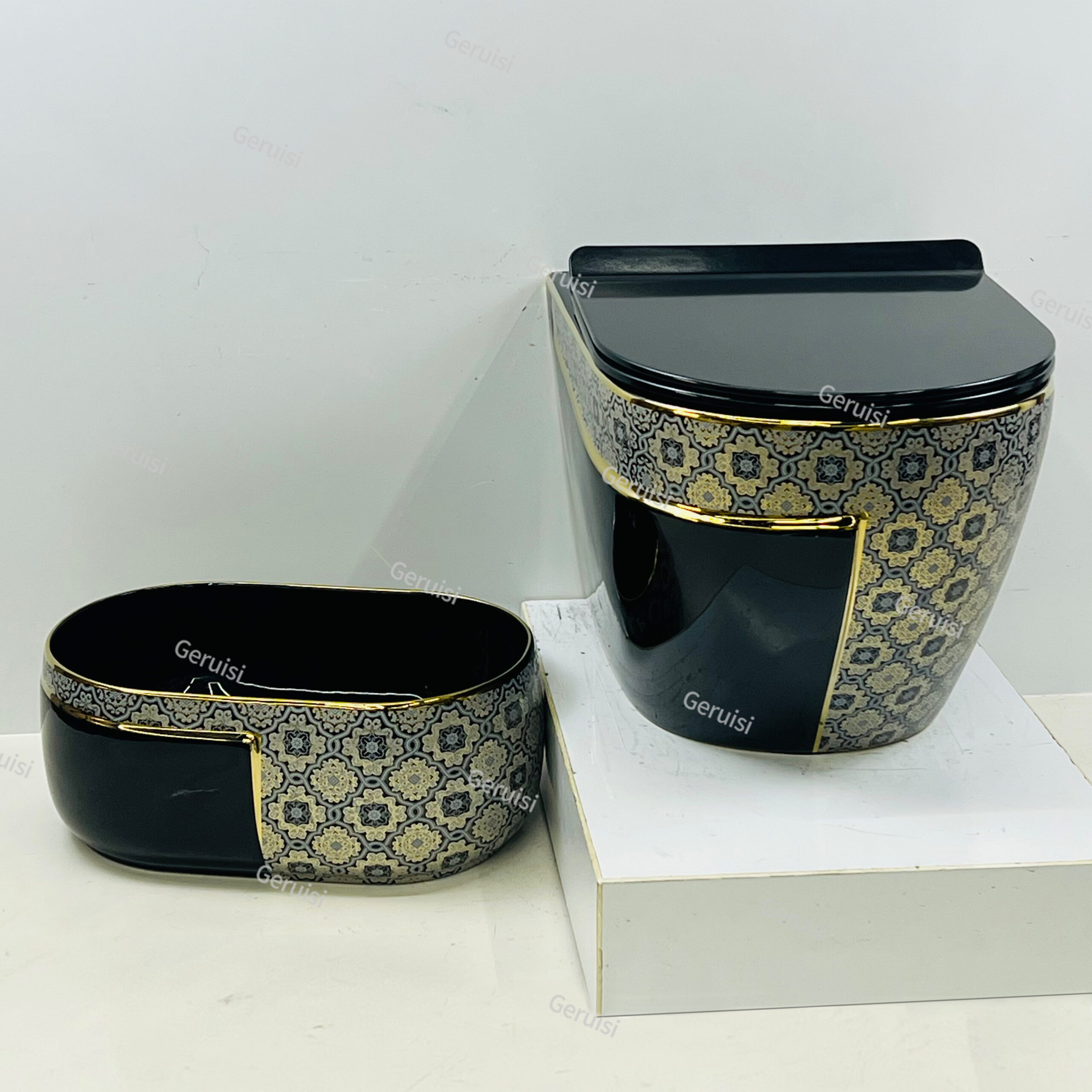 Luxury Golden Plated Painting Black Wall Hung Toilet Ceramic Table Top Oval Shape Deep Basin Bathroom Furniture Unit