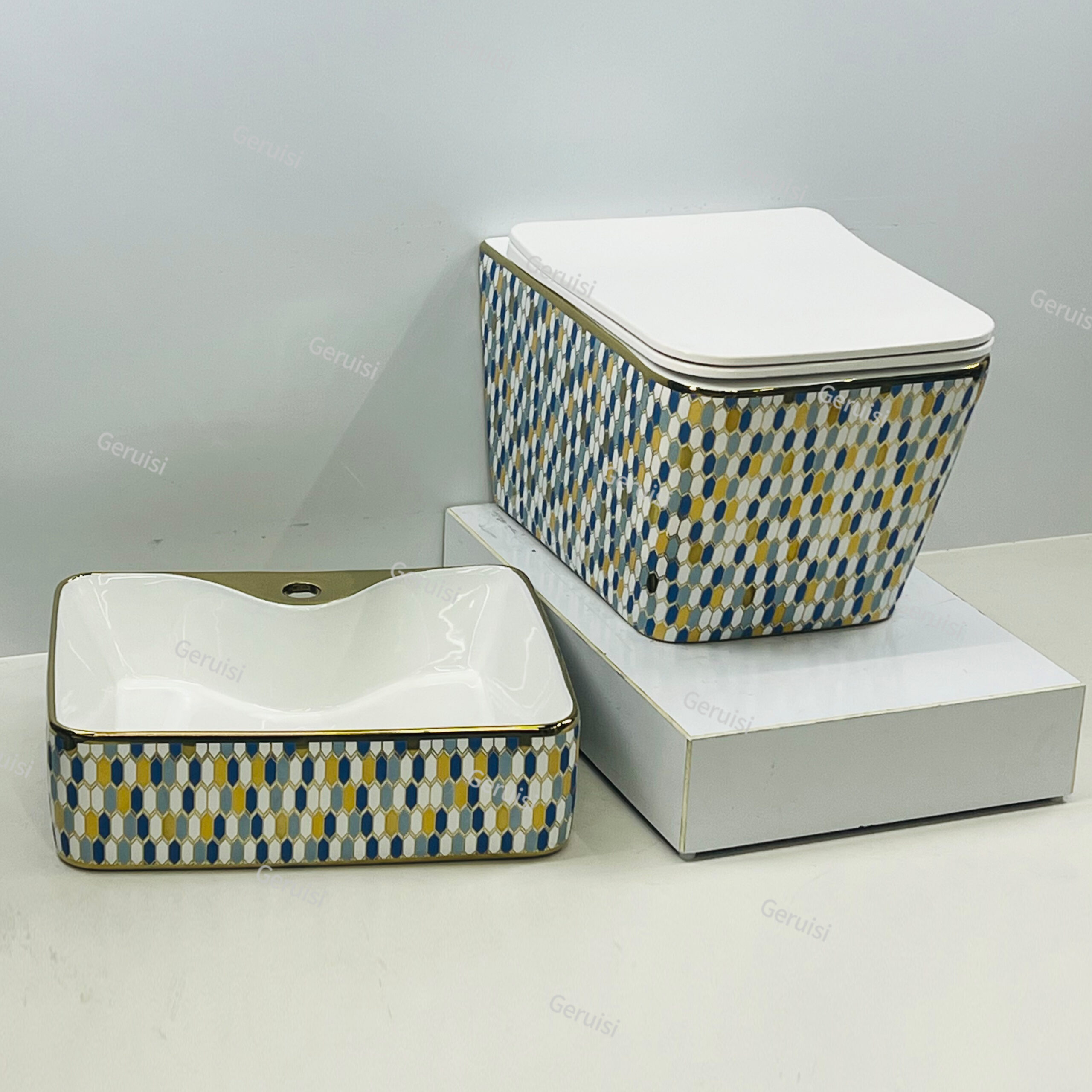Middle East Style Lavabo Ceramic Sanitary Ware Colorful Gold Plating Bathroom Wall Hung Toilet and Countertop Washbasin Unit