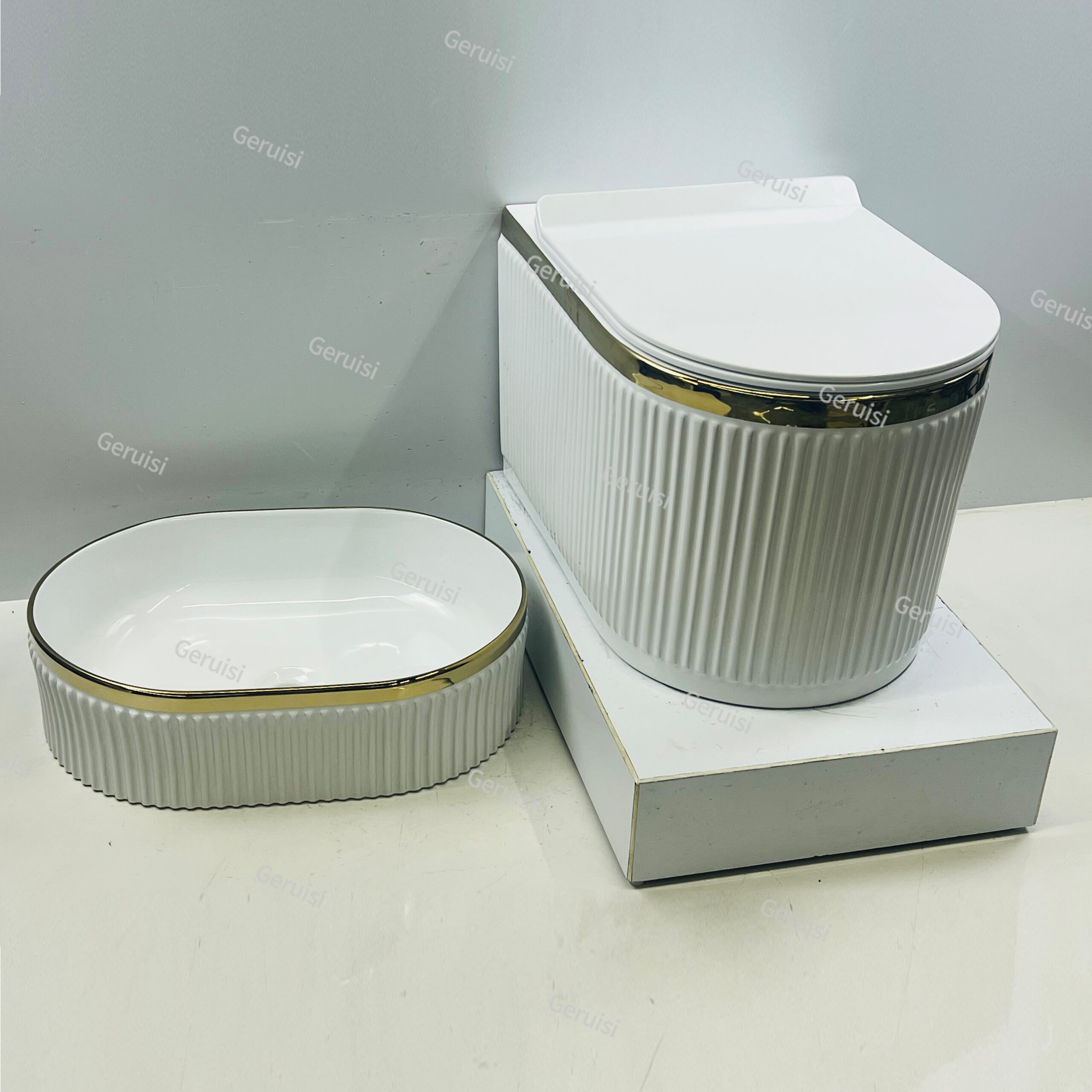 Minimalism Electroplated Golden with Fluted Surface White Toilet & Oval Basin Artistical Lavabo Interior Design Combination