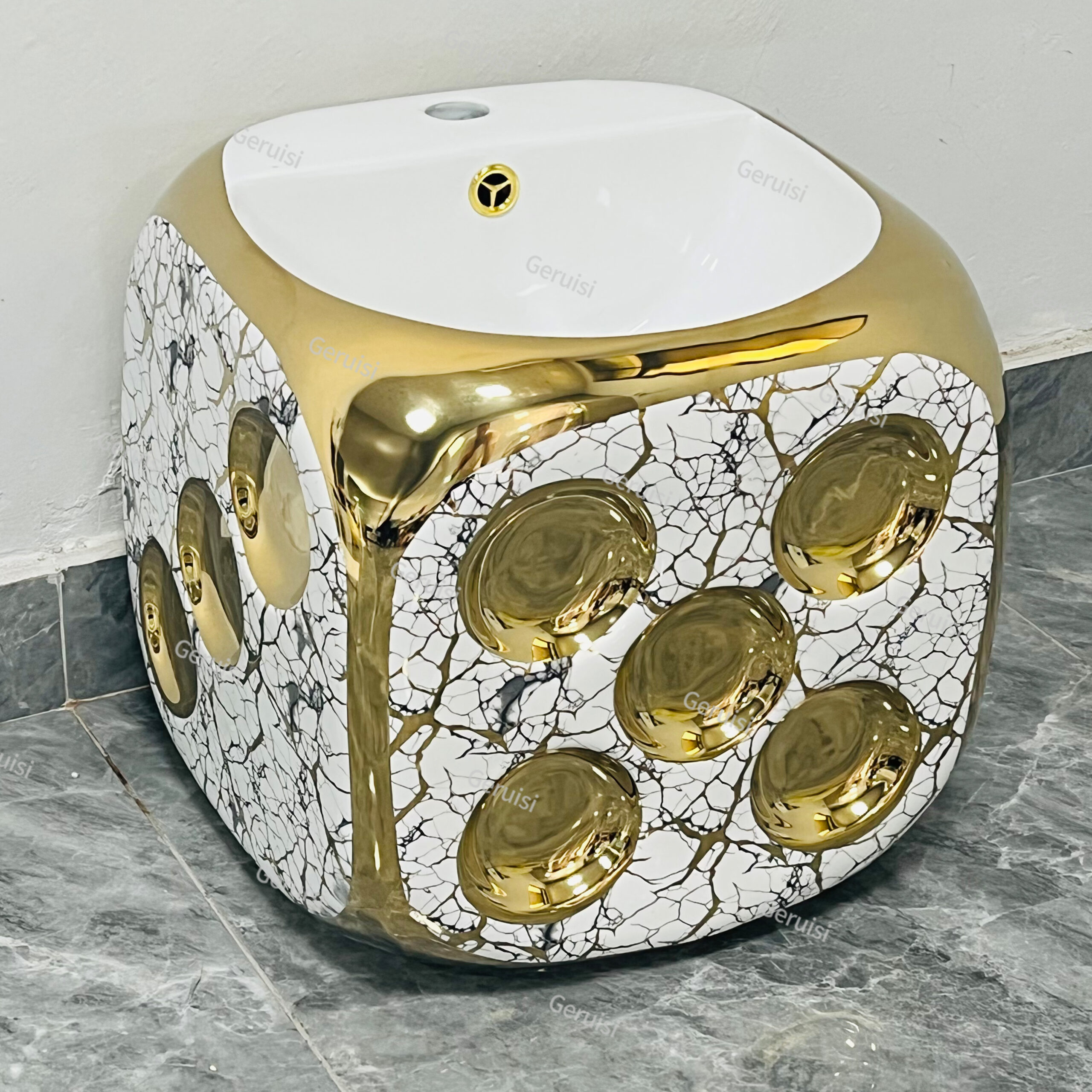 New arrival from Chaozhou factory porcelain table top ceramic square dice-shape sink luxury golden marble lines washbasin