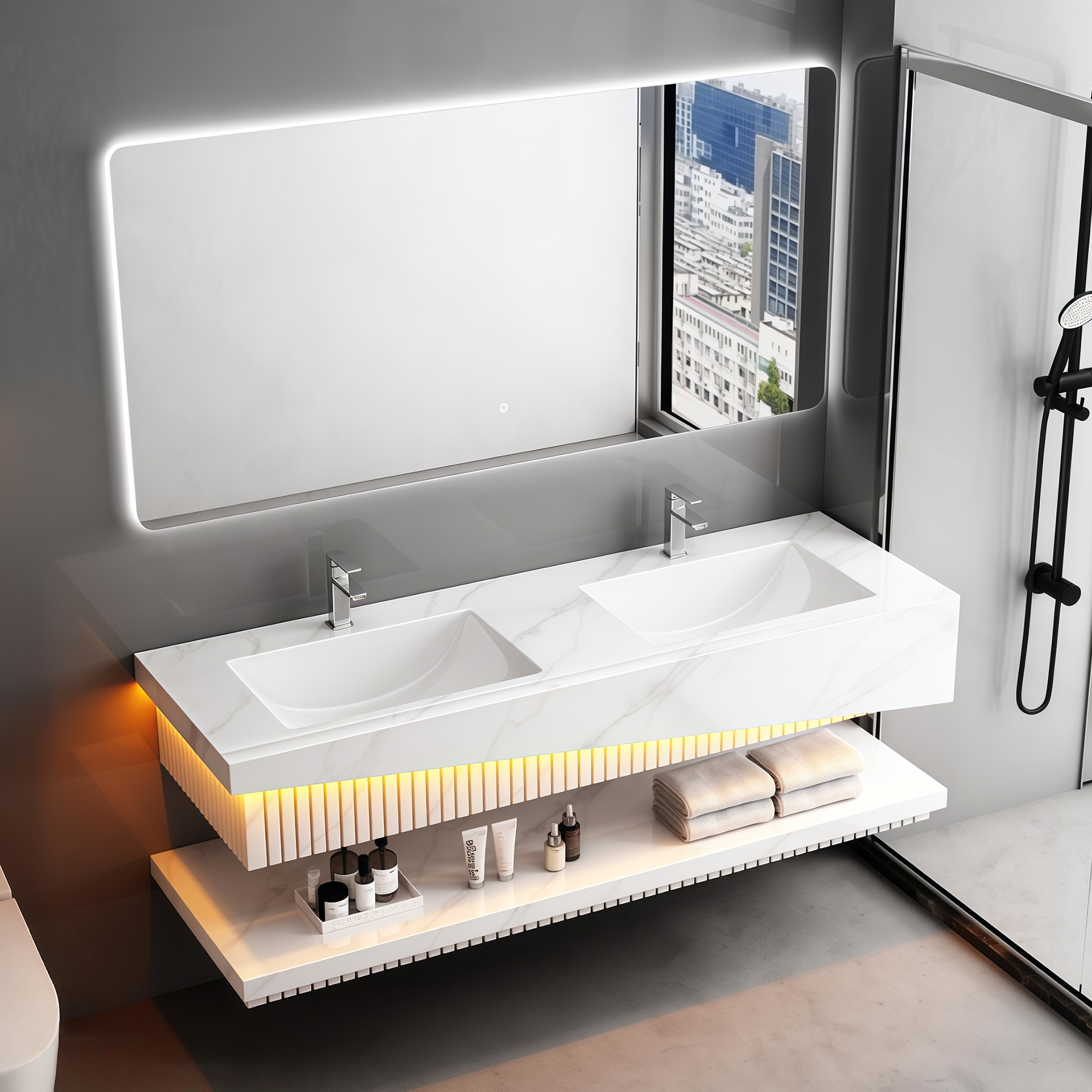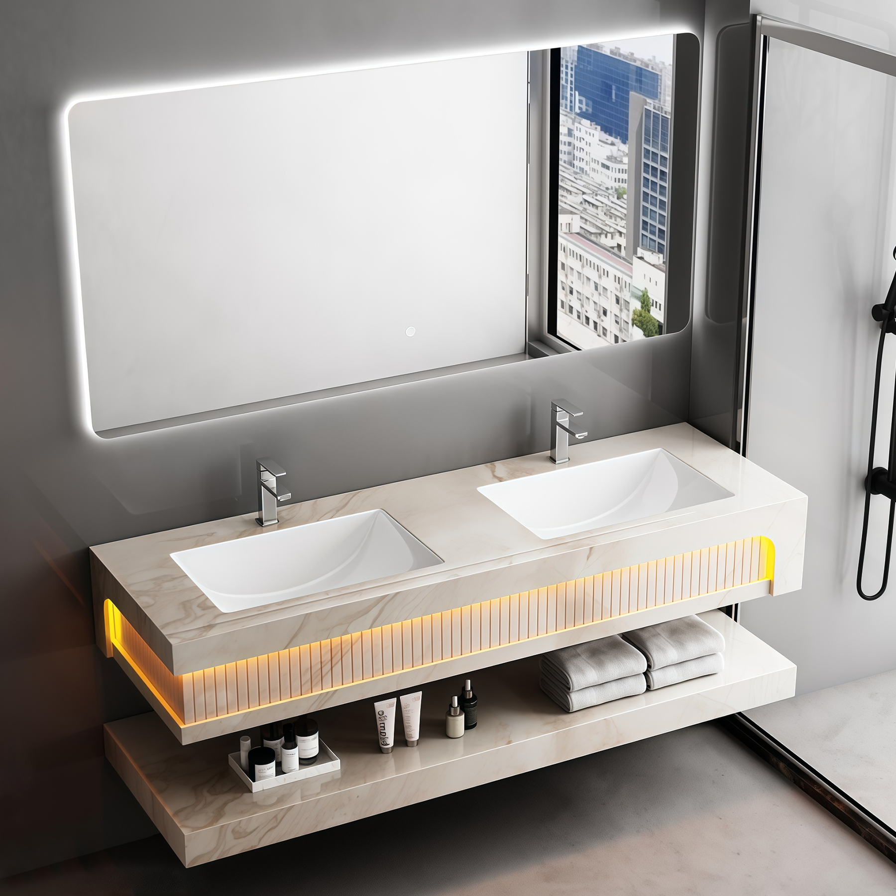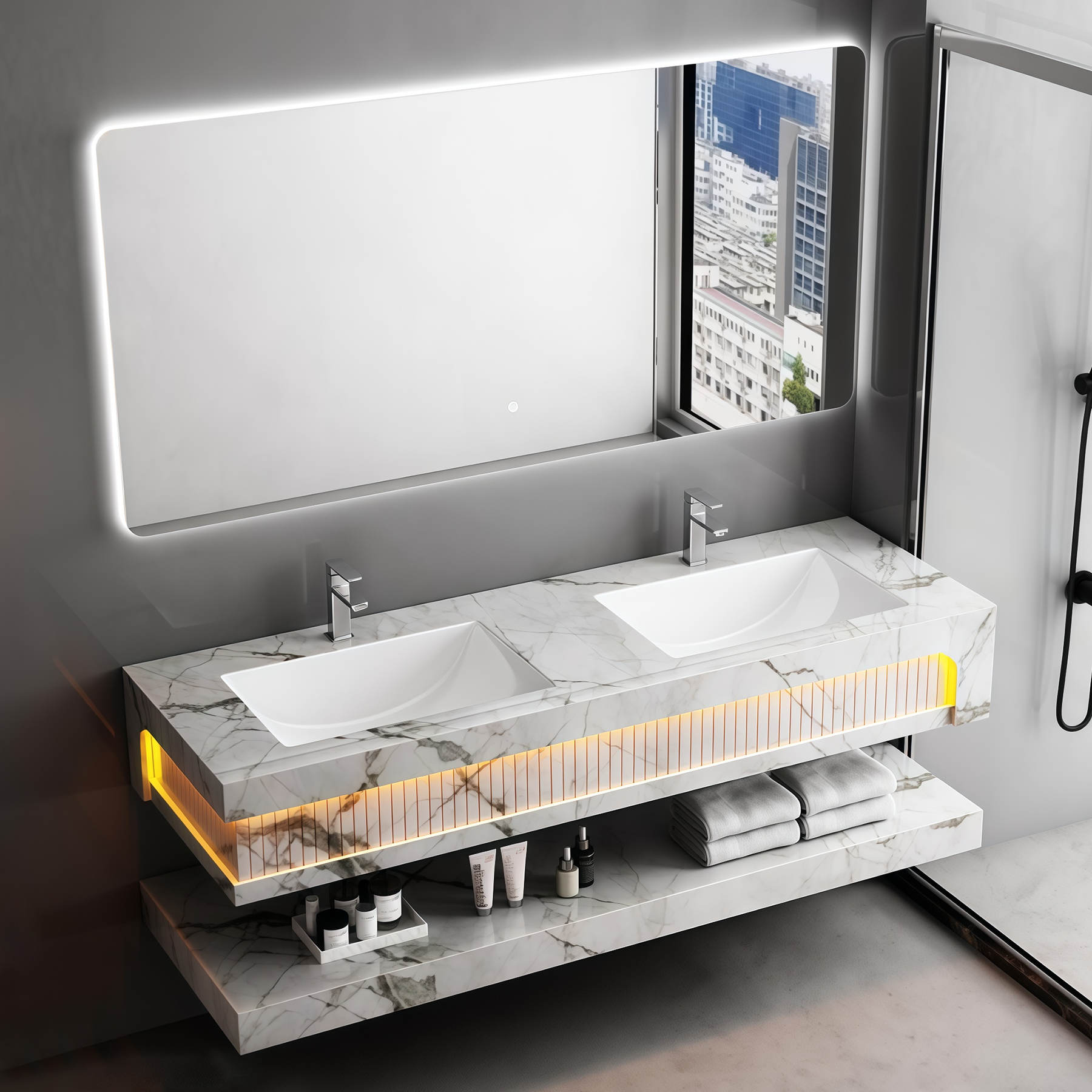 Quality Certification Rock Slab Bathroom Cabinet Two Ceramic Sinks Set Waterproof Wall Hung Artificial Stone Bathroom Vanities Factory Wholesaler
