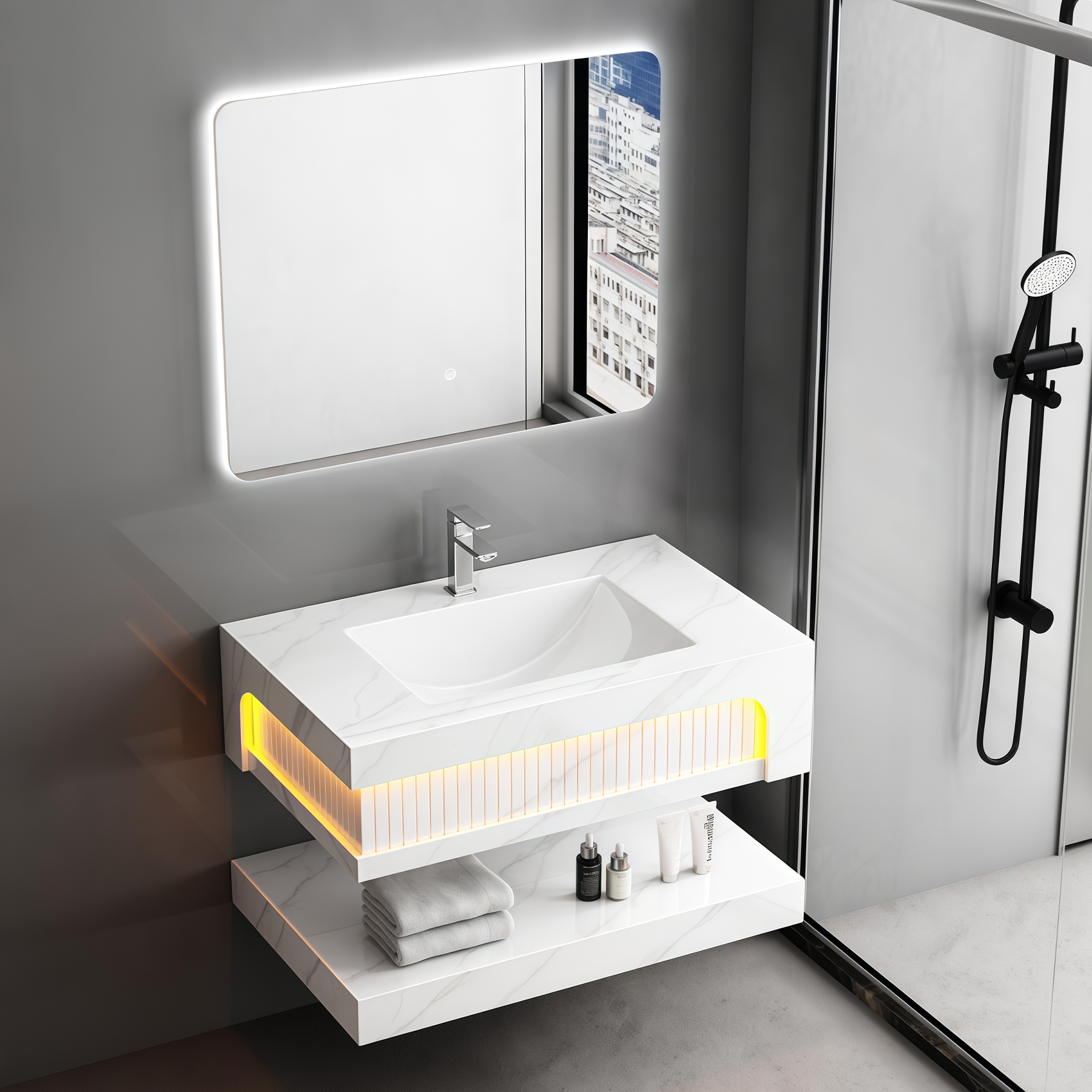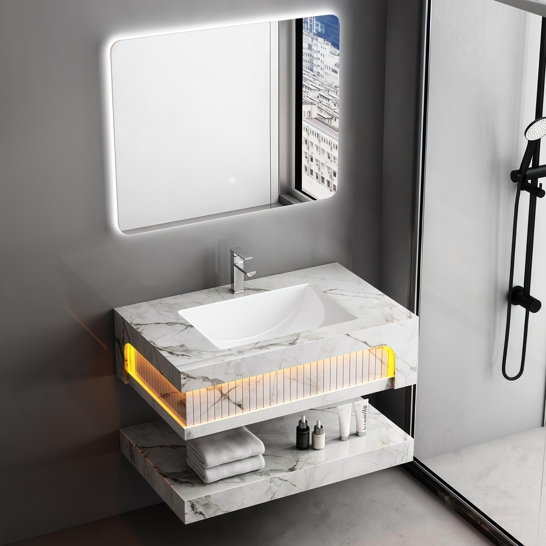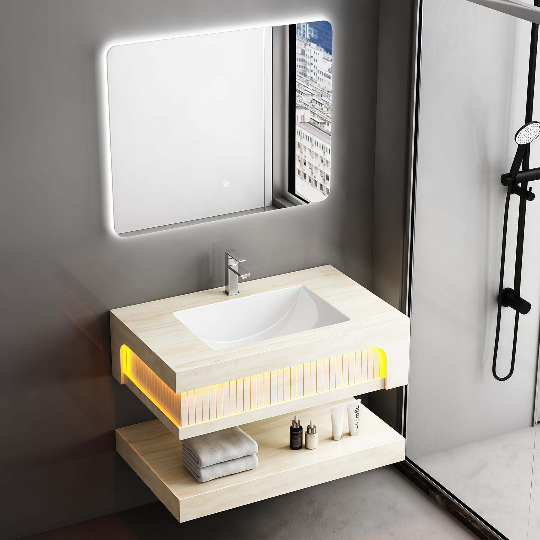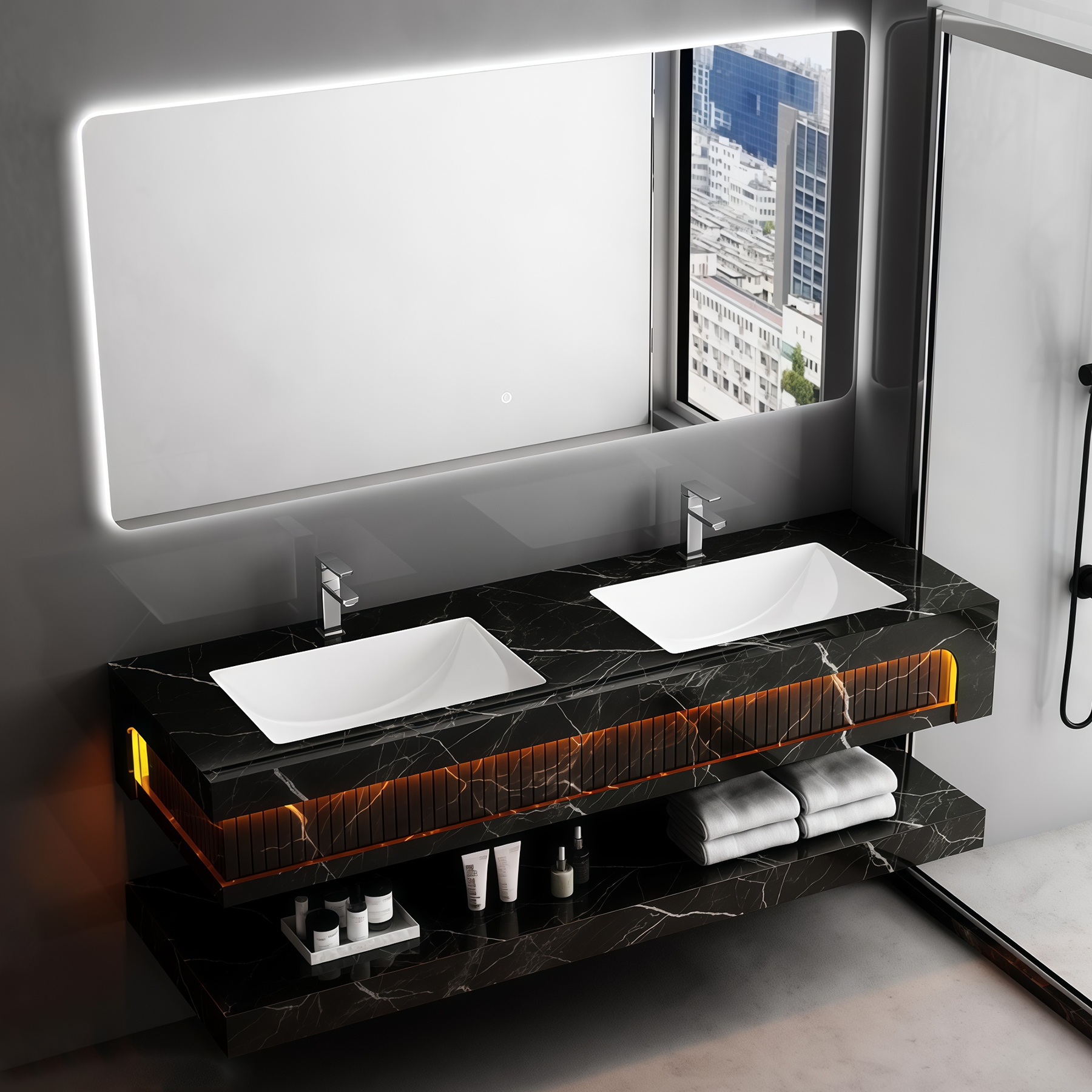 Quality Certification Rock Slab Bathroom Cabinet Two Ceramic Sinks Set Waterproof Wall Hung Artificial Stone Bathroom Vanities Factory Wholesaler