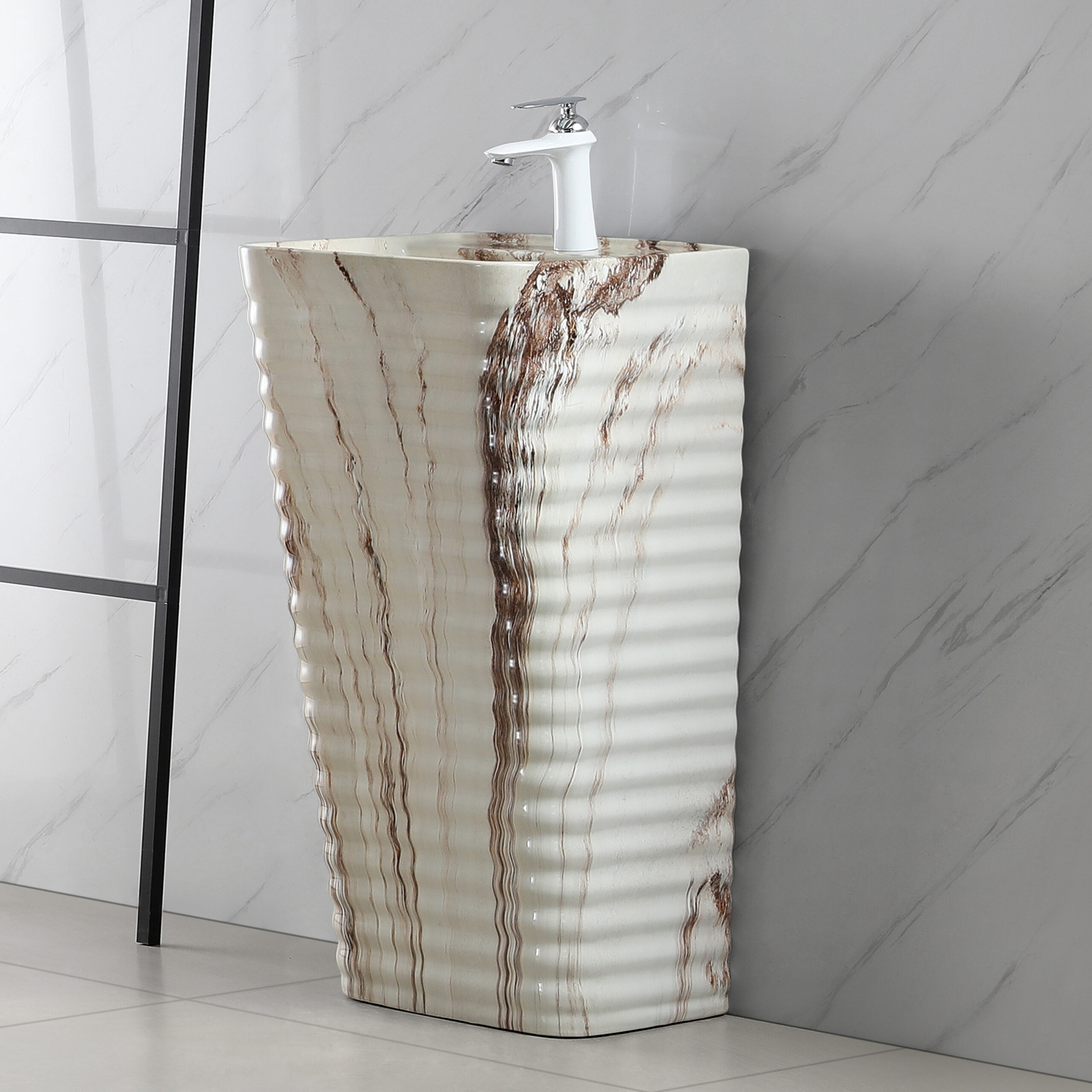 Splashed-ink Style Integrated Ground Mounted Square Washbasin Fluted Design Pedestal Sink Marble Colored Basin Bowl for Bathroom